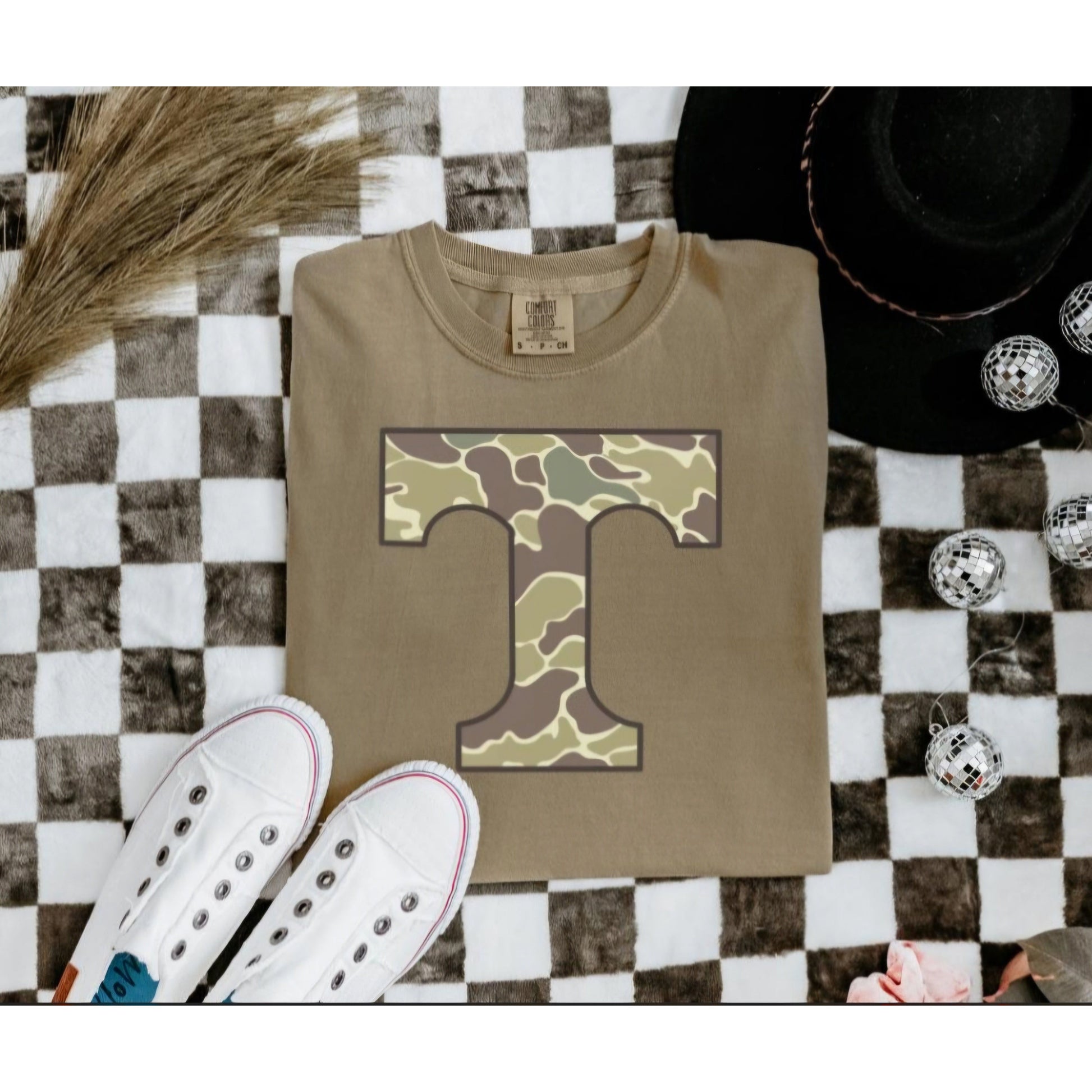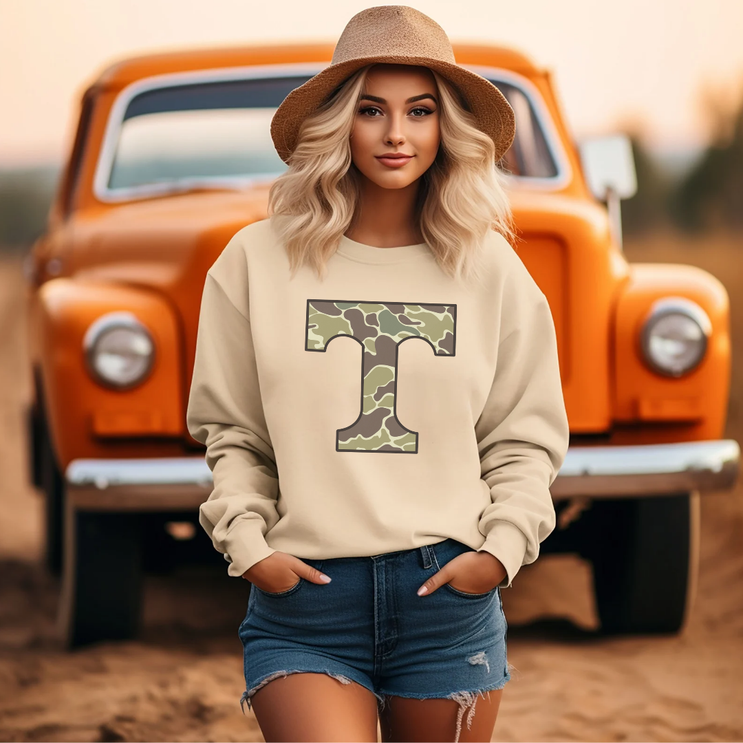 This Camo T Crewneck or Tshirt features a unique sports camo design, made with soft and breathable cotton material. Perfect for representing Tennessee and staying comfortable during any activity. Expertly designed for performance and style.