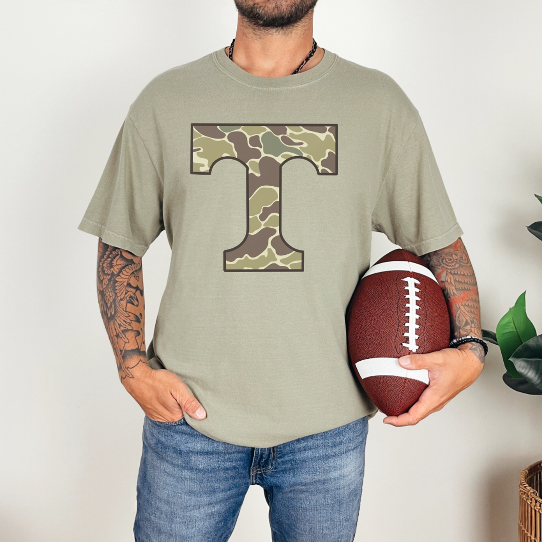 The Camo "T" T-shirt features a unique camo design and showcases your love for the Volunteer State. Made from quality t-shirt material, this shirt is both comfortable and stylish. Perfect for any fan of Tennessee or anyone looking to make a statement with their wardrobe.