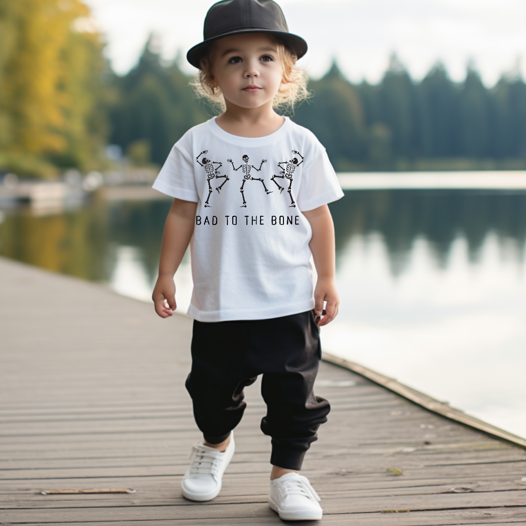 This Bad To The Bone Dancing Skeletons Toddler T-shirt is rad-ly cute! Your little one will look "skeleton cool" wearing this awesome tee featuring some groovy skeletons getting down on the dance floor. Get 'em before they "bone-tastically" disappear!